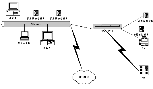 在一個有很多分支機(jī)構(gòu)的大企業(yè)的分部安裝Tw-IPBX ,通過IP 網(wǎng)絡(luò)與企業(yè)總部PBX 連接后后,可實現(xiàn)多種應(yīng)用,同時降低了成本。在這種應(yīng)用場景中,采用了基于IP 的傳輸機(jī)制(VoIP)。此種情況下VoIP的美好之處在于語音和數(shù)據(jù)的IP 傳輸管路需求(根據(jù)呼叫)的無縫可伸縮性,而無需任何靜態(tài)的分區(qū),這種解決方案可提供性能價格比極高且靈活的網(wǎng)絡(luò)運(yùn)作。