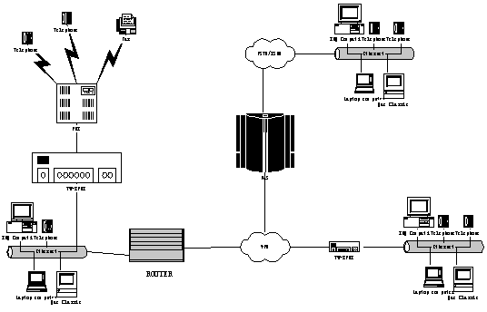 該應(yīng)用示意圖具有一個(iPBX )或多個辦公場地(nIPBX - 組網(wǎng)iPBX )提供電話系統(tǒng)解決方案。該解決方案是基于IP 電話技術(shù)而構(gòu)建的Tw-IPBX “一體化概念”,同時可提供傳統(tǒng)的模擬電話概念,如模擬電話和傳真機(jī)。以下敘述了客戶機(jī)組合的單獨應(yīng)用場景,包括: