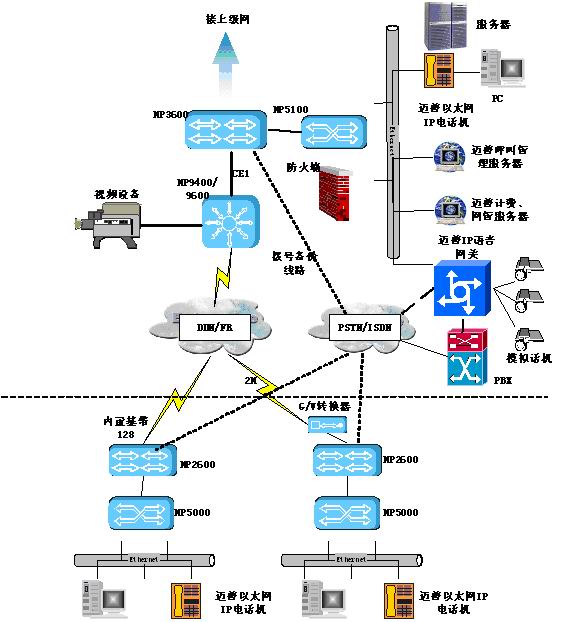 目前許多公安系統(tǒng)雖然采用具有IP語音功能的路由設(shè)備組建網(wǎng)絡(luò),但在業(yè)務(wù)語音交流通常還通過PBX集團(tuán)交換機(jī)走電信PSTN/ISDN電話網(wǎng),這樣無法節(jié)省電話費(fèi)用,反而增加了辦公費(fèi)用。邁普IP語音解決方案采用了邁普MyPower VG2000IP語音網(wǎng)關(guān)和邁普以太網(wǎng)IP電話進(jìn)行改造。在整個(gè)網(wǎng)點(diǎn)語音終端全部設(shè)備選用經(jīng)濟(jì)型邁普以太網(wǎng)IP電話機(jī),它采用雙以太口設(shè)計(jì),使網(wǎng)絡(luò)無需重新布線,同時(shí)也可使用已有的路由器上IP語音模塊;邁普以太網(wǎng)IP電話機(jī)之間的話音通信通過邁普呼叫管理服務(wù)器集中控制。在主體IP網(wǎng)絡(luò)中,邁普IP語音網(wǎng)關(guān)放置于中心機(jī)房作為傳統(tǒng)PSTN的出口,可以通過VOS接口、E1接口(中國一號信令)、E&M接口等多種方式接入公安PBX,將PSTN線路傳來的時(shí)分話音或傳真信息進(jìn)行分組和壓縮,轉(zhuǎn)換成IP數(shù)據(jù)包,通過路由設(shè)備路由到目的地;在沒有PBX的公安機(jī)房,邁普IP語音網(wǎng)關(guān)可以提供32路的模擬用戶接口,可以完全替代傳統(tǒng)PBX并接入PSTN,并提供額外功能,如圖中虛線所示;整個(gè)方案還可以針對公安用戶特殊需求"定做"特色功能,例如緊急告警等方便日常辦公。