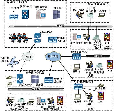 針對目前銀行對IP語音的應用需求,邁普結合現在網絡的發(fā)展狀況和最新的IP電話技術,專門提出了針對銀行全省范圍的經濟型的IP語音電話組網解決方案。
