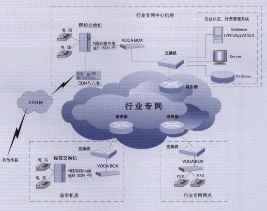 中心并設(shè)立一級計費認證及結(jié)算中心、網(wǎng)絡管理中心(VBMS),對網(wǎng)內(nèi)電話集中管理和計費。通過在各地市機構(gòu)原有的內(nèi)部網(wǎng)絡基礎(chǔ)上增加數(shù)臺VOCABOX實現(xiàn)語音終端接入,并在地市機構(gòu)通過帶FXO接口的VOCABOX實現(xiàn)內(nèi)部IP電話與內(nèi)部電話網(wǎng)絡的呼叫轉(zhuǎn)接,網(wǎng)絡拓撲連接如下圖所示