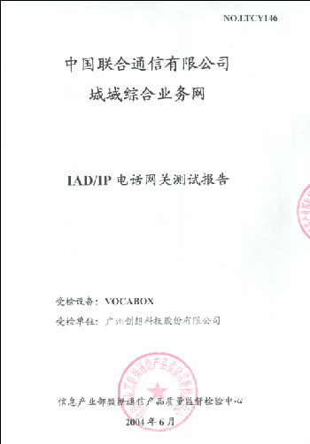 。。近日,廣州創(chuàng)想科技股份有限公司得到信產(chǎn)部數(shù)據(jù)通信產(chǎn)品質(zhì)量監(jiān)督檢測中心的通知:VOCABOX/IAD通過了中國聯(lián)通城域綜合業(yè)務(wù)網(wǎng)IAD/IP電話語音網(wǎng)關(guān)入圍測試。