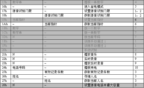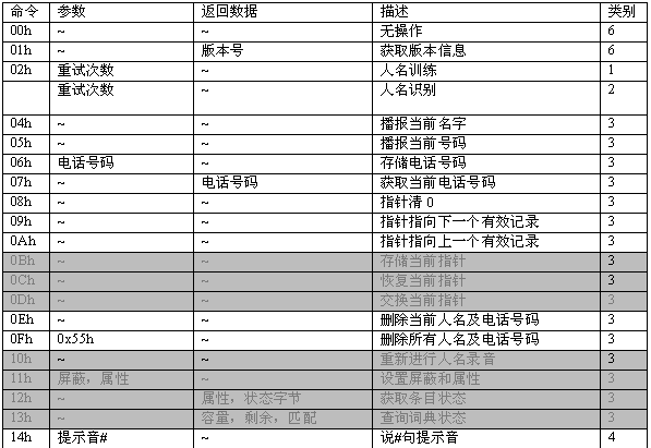 命令描述: 訓(xùn)練一個(gè)名字。當(dāng)增加一條電話(huà)本記錄時(shí),應(yīng)先執(zhí)行此命令。該命令會(huì)生成一個(gè)語(yǔ)音模板,同時(shí)產(chǎn)生一個(gè)長(zhǎng)達(dá)2秒的名字錄音。在此命令成功執(zhí)行之后,MCPU接著發(fā)送06h命令增加電話(huà)號(hào)碼。如果沒(méi)有執(zhí)行06h命令,則該項(xiàng)記錄電話(huà)號(hào)碼為空。