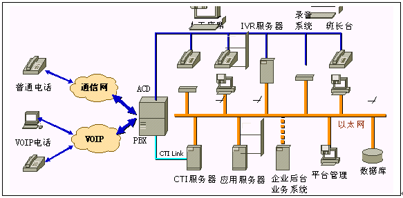 ·PBX/ACD:實(shí)現(xiàn)電話呼入、呼出和話務(wù)管理等功能,提供自動(dòng)排隊(duì)機(jī)系統(tǒng),實(shí)現(xiàn)對(duì)來(lái)話的均衡分配
