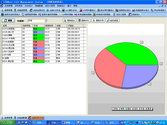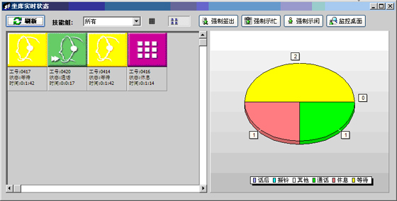 當(dāng)前座席狀態(tài):能夠提供座席的狀態(tài)表示,狀態(tài)持續(xù)時間,對應(yīng)的技能組,對應(yīng)的分機(jī)號碼,對應(yīng)的IP地址等信息。可以對任何一個座席進(jìn)行強(qiáng)制簽出、強(qiáng)制示忙、強(qiáng)制示閑操作?梢詫θ我庾M(jìn)行屏幕監(jiān)控操作(無需任何第三方軟件)。