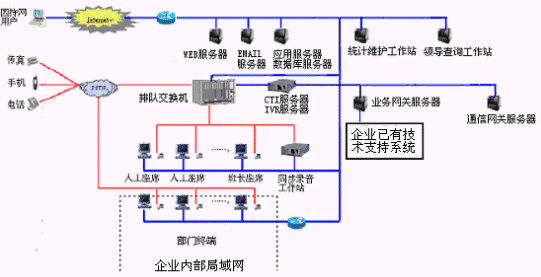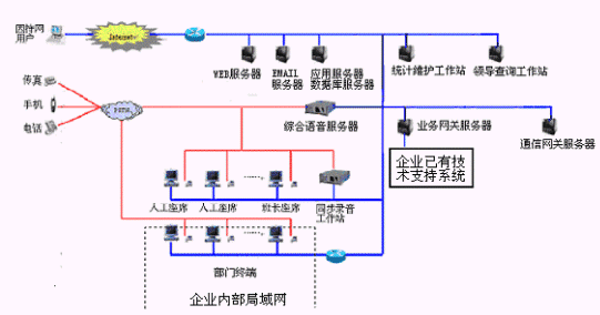 網(wǎng)上服務(wù)系統(tǒng):與INTENET結(jié)合,接受來自網(wǎng)上的呼叫請(qǐng)求,提高服務(wù)和營銷的質(zhì)量和效率。