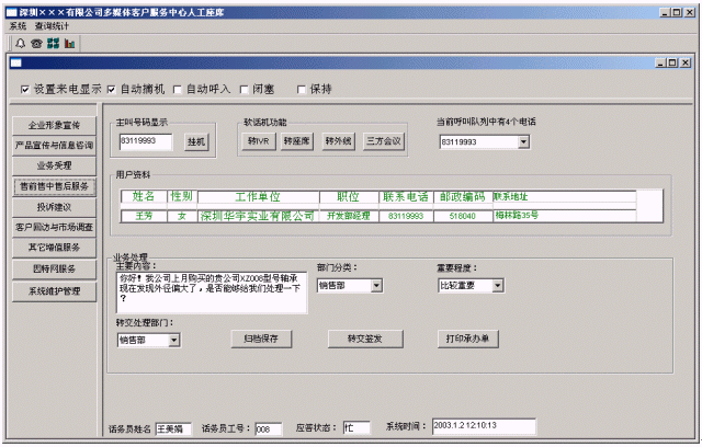 (2)提高家電企業(yè)親切感:系統(tǒng)在人工服務(wù)狀態(tài)下,當(dāng)業(yè)務(wù)代表輸入客戶名稱時(shí),系統(tǒng)即時(shí)將客戶與家電企業(yè)相關(guān)的信息顯示在座席終端上,使業(yè)務(wù)及時(shí)了解客戶,有針對性回答客戶問題,使客戶倍感親切。