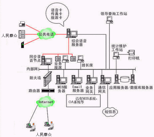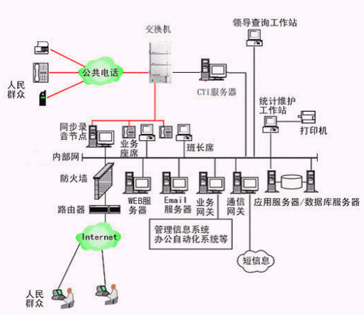 本系統(tǒng)物理結(jié)構(gòu)由排隊交換機(jī)、CTI服務(wù)器、IVR(交互式語音應(yīng)答)/IFR(交互式傳真應(yīng)答)服務(wù)器、業(yè)務(wù)代表座席(邏輯上分為:普通業(yè)務(wù)代表座席、專家座席、WEB座席等)、班長座席、統(tǒng)計維護(hù)管理工作站、因特網(wǎng)(WEB)服務(wù)器、電子郵件(EMAIL)服務(wù)器、數(shù)據(jù)庫/應(yīng)用服務(wù)器、錄音留言工作站、領(lǐng)導(dǎo)查詢工作站、業(yè)務(wù)網(wǎng)關(guān)服務(wù)器、通信網(wǎng)關(guān)、網(wǎng)絡(luò)系統(tǒng)等和應(yīng)用軟件構(gòu)成。