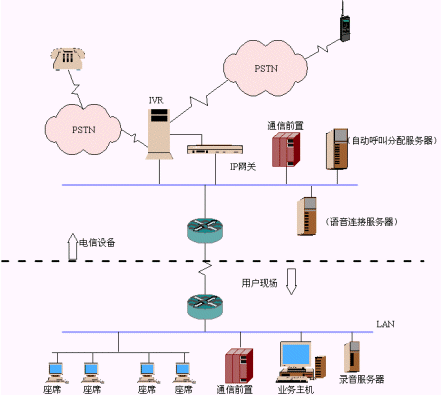 根據(jù)目前連鎖零售服務(wù)企業(yè)的業(yè)務(wù)模式,現(xiàn)提供一個(gè)由IVR自動(dòng)語(yǔ)音應(yīng)答系統(tǒng)和以IP網(wǎng)絡(luò)為基礎(chǔ),以純軟方式交換的呼叫中心相結(jié)合的整體解決方案。即由吉亞公司在北京通信公司建立一個(gè)總的系統(tǒng)信息平臺(tái),平臺(tái)包括IP網(wǎng)關(guān)、ACD服務(wù)器、IVR自動(dòng)語(yǔ)音回復(fù)系統(tǒng)。信息平臺(tái)與連鎖零售服務(wù)企業(yè)的局域網(wǎng)通過(guò)ATM、DDN或幀中繼等專(zhuān)線(xiàn)連接,實(shí)現(xiàn)與客服人員和后臺(tái)數(shù)據(jù)庫(kù)的無(wú)縫連接,在連鎖零售服務(wù)企業(yè)內(nèi)部?jī)H需提供多媒體電腦和客戶(hù)服務(wù)人員即可。