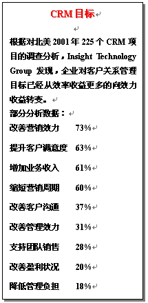 3.對于客戶關系管理工作的總體目標有明確的設定,并可據(jù)此逐步分解到效益收益、客戶管理、業(yè)務運營、組織人員和信息技術(shù)等具體客戶關系管理目標;