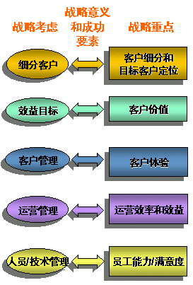 客戶關系管理戰(zhàn)略一般由以下5個部分的戰(zhàn)略考慮和相關的戰(zhàn)略重點構(gòu)成: