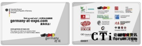 CTI論壇(ctiforum)5月17日消息(記者 潘婷婷):2010年5月,世人矚目的上海世博會(huì)已經(jīng)隆重開(kāi)幕,德國(guó)館是其中的大熱門(mén)之一。想一睹德國(guó)館的風(fēng)采,一般都需要排2~3個(gè)小時(shí)的長(zhǎng)隊(duì)。而觀眾可能不知道除了德國(guó)國(guó)家館外,德國(guó)還有多個(gè)城市在浦西的城市最佳實(shí)踐區(qū)展出。為了讓觀眾更好、更全面地體驗(yàn)德國(guó)參展的所有活動(dòng),德國(guó)駐上?傤I(lǐng)事館聯(lián)手智能卡領(lǐng)域的專(zhuān)家捷德公司共同推出了德國(guó)館智能參觀卡,觀眾只需持卡參觀德國(guó)的其他相關(guān)展區(qū)后,就可以不用排隊(duì)進(jìn)入德國(guó)國(guó)家館了。