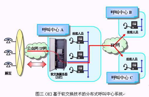 現(xiàn)在以O(shè)KI的軟交換呼叫中心為例,來分析一下軟交換技術(shù)在呼叫中心領(lǐng)域的應(yīng)用特色。從圖中我們可以看出,OKI的軟交換技術(shù)是基于SIP協(xié)議開發(fā)的。構(gòu)架在Internet基礎(chǔ)上的SIP協(xié)議,符合Internet