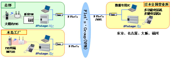 SX”通過SIP協(xié)作的IP電話系統(tǒng)。系統(tǒng)中所采用的“IPstage MX/SX”通過NTT西日本的VPN服務(wù)“Flet's・Group”相互連接,實(shí)現(xiàn)高音質(zhì)的內(nèi)線環(huán)境。使用內(nèi)線電話號(hào)碼進(jìn)行事業(yè)所之間的通話聯(lián)系,可以直接與想聯(lián)系的對(duì)象通話,無需傳叫電話。進(jìn)而,由于工廠采用了沖電氣所制造的PHS終端“UM7588”,可以在工廠任何地方實(shí)現(xiàn)直接電話聯(lián)系。導(dǎo)入該系統(tǒng)后,即使業(yè)務(wù)場(chǎng)所分處幾地,也能成功實(shí)現(xiàn)員工間的迅速溝通。