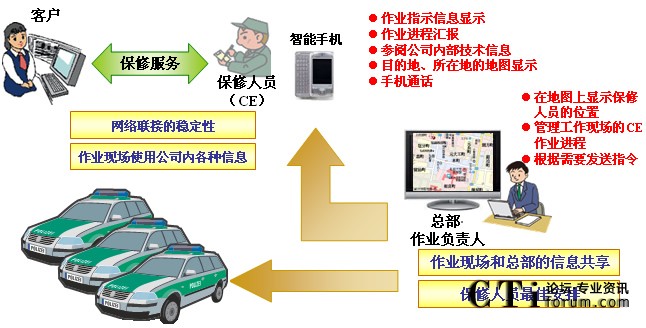 “MoBiz AP for CE支持系統(tǒng)”在加強(qiáng)總部和現(xiàn)場維修人員的聯(lián)動(dòng)基礎(chǔ)上,通過準(zhǔn)確把握地點(diǎn)信息和作業(yè)進(jìn)展?fàn)顩r,有效安排工作人員,從而達(dá)到提高工作人員一天的工作現(xiàn)場訪問次數(shù)。進(jìn)一步說,有助于客戶SLA(注3)的遵守和客戶滿意度(CS)的提高。