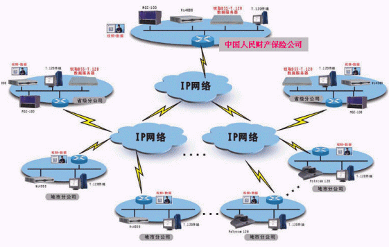 中國人民財產(chǎn)保險股份有限公司,是中國內(nèi)地最大的非壽險公司,香港證交所上市公司。經(jīng)過50多年的發(fā)展,中國人保財險公司已經(jīng)發(fā)展成為網(wǎng)點遍布全國31個省市區(qū),共有營業(yè)機(jī)構(gòu)4000余個的大型商業(yè)公司。為提高辦公效率,降低差旅成本,中國人保財險公司決定建設(shè)覆蓋從總公司、省分公司到地市分公司的視頻會議系統(tǒng),項目總?cè)萘窟_(dá)600多個節(jié)點,采用兩級級連方式組網(wǎng),要求系統(tǒng)具備視頻、音頻、數(shù)據(jù)交互功能,。