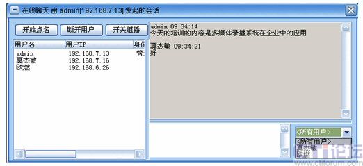 系統(tǒng)增加了多方文字互動(dòng)聊天功能,在線聊天功能可以選擇給所有人員發(fā)送消息,也可以選擇給某一特定人員發(fā)送。這樣在會(huì)議或培訓(xùn)的過(guò)程中,管理員可以選擇性的提出相應(yīng)的問(wèn)題給相關(guān)人員,考核相關(guān)人員的培訓(xùn)效果;其他人員也可以將會(huì)議或培訓(xùn)過(guò)程中遇到的疑問(wèn)、難點(diǎn)及時(shí)的反應(yīng)給管理員進(jìn)行解答,增強(qiáng)會(huì)議的成效。