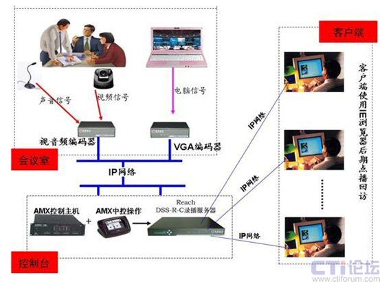銳取多媒體錄播系統(tǒng)采用了分布式的產(chǎn)品架構(gòu),多媒體錄播服務(wù)器部署在后臺控制間或機(jī)房,各種類型的信號編碼器安裝在前端會(huì)議室,兩者之間通過IP網(wǎng)絡(luò)通訊,工程施工及后期設(shè)備內(nèi)文件資源管理都非常方便。