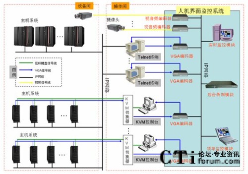如上圖所示,該機房分為設備間和操作間,小型機等主機系統(tǒng)安裝在設備間內(nèi),平時工作人員通常在操作間內(nèi)通過Telnet終端及KVM控制臺等方式訪問主機系統(tǒng)進行操作,這些Telnet終端、KVM控制臺即為機房內(nèi)人與機器打交道的“人機界面”。