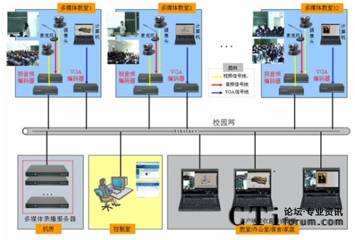 華東師大多媒體錄播項(xiàng)目系統(tǒng)組網(wǎng)如上圖所示。在本項(xiàng)目中12間多媒體教室內(nèi)均實(shí)現(xiàn)錄播功能,編碼器和多媒體錄播服務(wù)器分別部署在教室和機(jī)房?jī)?nèi),管理員在控制室通過(guò)網(wǎng)絡(luò)進(jìn)行遠(yuǎn)程管理、控制,老師、學(xué)生可在教室、辦公室、宿舍等任何可以連接校園網(wǎng)的地方實(shí)時(shí)觀看各間教室內(nèi)進(jìn)行的課程,可滿足日常多媒體教學(xué)、課件錄制、微格教學(xué)等應(yīng)用的需要。其中涉及銳取設(shè)備清單及說(shuō)明如下:
