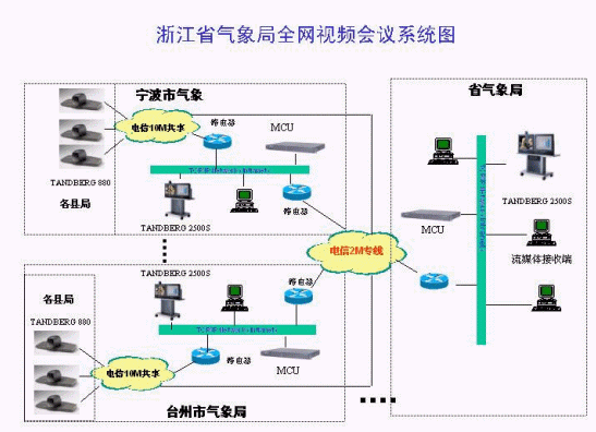 浙江省氣象局為了響應全國氣象系統(tǒng)的號召,充分利用自己網(wǎng)絡資源的優(yōu)勢,于2003年初經(jīng)過系統(tǒng)方案的征集、產品的反復測試,最終確定了由華夏科技代理的挪威TANDBERG的視頻終端,并于2003年9月份簽訂了一期采購合同,共計40多套視頻終端。