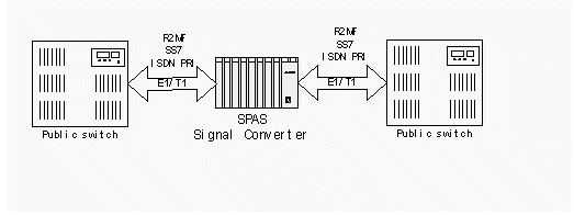因?yàn)樾帕顦?biāo)準(zhǔn)不同,部分國外通信設(shè)備無法與國內(nèi)通訊網(wǎng)互通互連,SPAS-2000可編程交換機(jī)接口豐富,支持信令標(biāo)準(zhǔn)全面,成本低廉,可以為中國一號信令、七號信令、ISDN PRI(E1/T1)、環(huán)路信令、接入網(wǎng)V5信令等標(biāo)準(zhǔn)之間的轉(zhuǎn)換提供靈活完整的解決方案,同時當(dāng)輸入和輸出的中繼接口不同時,其語音編碼可能不同,可利用多功能信號音板實(shí)現(xiàn)語音編碼的轉(zhuǎn)換(例如可以實(shí)現(xiàn)A LAW和U LAW之間的語音互轉(zhuǎn))。連接圖見圖1:
