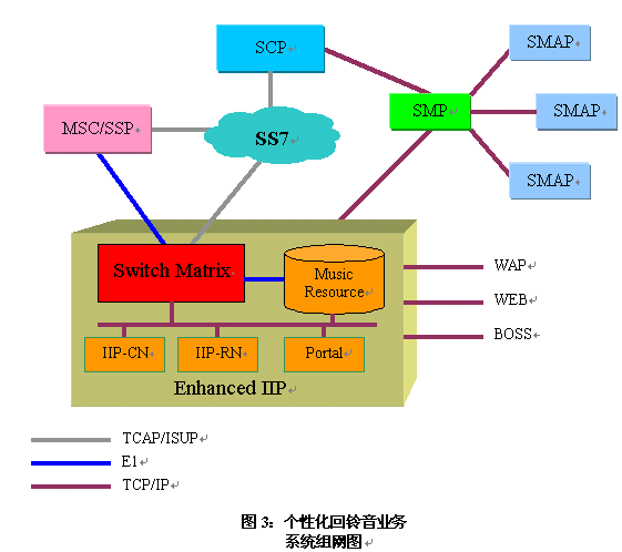 個(gè)性化回鈴音業(yè)務(wù)是基于智能網(wǎng)平臺(tái)實(shí)現(xiàn)的全新增值智能業(yè)務(wù),采用被叫簽約信息T-CSI觸發(fā)的方式。具體實(shí)現(xiàn)時(shí)利用現(xiàn)有智能網(wǎng)結(jié)構(gòu),將業(yè)務(wù)邏輯加載在SCP上,MSC/SSP根據(jù)用戶的歸屬HLR中的T-CSI信息,觸發(fā)智能業(yè)務(wù)到用戶歸屬的SCP上,并進(jìn)行相應(yīng)的業(yè)務(wù)控制處理。在呼叫過(guò)程中,由SCP控制獨(dú)立IP,向用戶提供音樂(lè)回鈴音。其中的Switch
