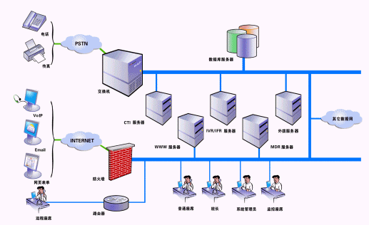 SmartCon呼叫中心由數(shù)字程控交換機(或中繼板卡)、計算機電話集成服務(wù)器(SmartCTI)、交互式語音/傳真應(yīng)答服務(wù)器(SmartIVR/IFR)、多通道數(shù)字錄音服務(wù)器(SmartMDR)、自動呼叫分配服務(wù)器(SmartACD)、地理信息系統(tǒng)服務(wù)器(SmartGIS)、Email服務(wù)器、座席終端系統(tǒng)(SmartAgent)、業(yè)務(wù)統(tǒng)計管理子系統(tǒng)、系統(tǒng)安全管理子系統(tǒng)、數(shù)據(jù)庫服務(wù)器等組成,其中交換機又可作為本單位內(nèi)部電話交換機使用。系統(tǒng)的網(wǎng)絡(luò)結(jié)構(gòu)示意圖如下: