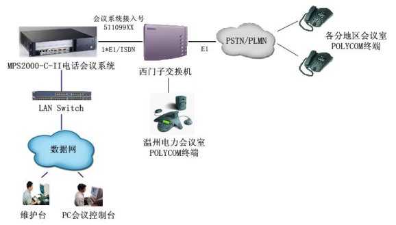 MPS2000-C電話會議系統(tǒng)通過數(shù)字中繼(采用ISDN信令)與溫州電力原有的西門子交換機(jī)互聯(lián),作為會議應(yīng)用服務(wù)器,為溫州電力原有電話網(wǎng)絡(luò)內(nèi)的用戶提供電話會議功能。