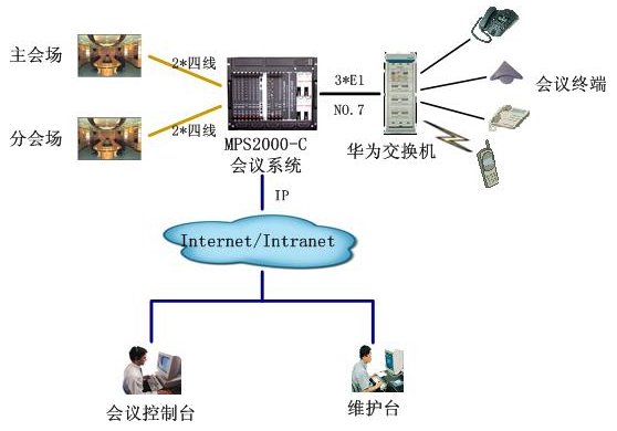 該會(huì)議系統(tǒng)和廊坊電力的會(huì)議系統(tǒng)組網(wǎng)方式相同,通過3個(gè)數(shù)字中繼,與華為用戶交換機(jī)互連,通信采用NO.7信令。4路4線中2路接主會(huì)場調(diào)音臺,2路接分會(huì)場調(diào)音臺,實(shí)現(xiàn)會(huì)議室擴(kuò)音設(shè)備的接入。通過以太網(wǎng)口與D-LINK網(wǎng)絡(luò)交換機(jī)互連,接入秦皇島電力的局域網(wǎng),實(shí)現(xiàn)維護(hù)管理及會(huì)議控制等功能。