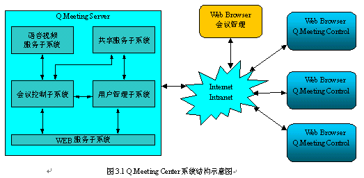 由于采用基于WEB的客戶端,Q.Meeting Center的部署是比較簡單的。只需按Q.Meeting Server的運(yùn)行環(huán)境要求安裝配置好會(huì)議服務(wù)器即可。主持人和其他與會(huì)者使用普通PC機(jī)通過WEB瀏覽器訪問會(huì)議URL地址即可參加會(huì)議。