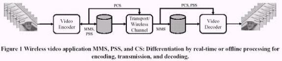 雖然新的服務(wù)如多媒體廣播/組播服務(wù)(MBMS)是未來無線網(wǎng)絡(luò)的發(fā)展計劃,但我們被約束成單一的應(yīng)用程序接受者。移動手持設(shè)備受處理器速度和存儲容量的限制,因此,移動視頻編碼的設(shè)計必須以最低復(fù)雜度和最高效率為目標(biāo)。正如其它文章所討論的復(fù)雜問題一樣,我們將自己約束在傳輸和工具上。以上三點定義的應(yīng)用可以在預(yù)定的的傳輸帶寬里面,最大限度地允許端到端的時延,在不同的系統(tǒng)結(jié)構(gòu)有不同的結(jié)果,一個簡單的圖示如圖一。