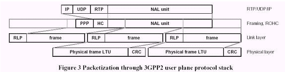 因為包交換服務(wù),3GPP/3GPP2同意了一個基于IP的協(xié)議棧。圖3展示了一個NAL單元通過3GPP2用戶平面協(xié)議堆棧被封裝在RTP/UDP/IP的典型過程。在頭壓縮(RoHC)后,此IP/UDP/RTP包被封裝進(jìn)一個PDCP/PPP2包,變成了頻率鏈路控制(RLC)和服務(wù)數(shù)據(jù)單元(SDU)。RLC協(xié)議可以在三種模式下工作:透明、非確認(rèn)和確認(rèn)模式。RLC協(xié)議為用戶和數(shù)據(jù)提供分段和重傳服務(wù)。在透明和非確認(rèn)模式,RLC被定義為單向的;在確認(rèn)模式,RLC被定義為雙向的。對於所有的RLC模式,循環(huán)冗余檢查(CRC)的錯誤檢測在物理層上被運行,而且CRC檢查的結(jié)果和真實的數(shù)據(jù)一起被遞送到 RLC。在透明模式中,沒有上層的協(xié)議被增加到較高層的數(shù)據(jù)中。錯誤的協(xié)議數(shù)據(jù)單元(PDUs)可以被丟棄或標(biāo)記為錯誤。在非確認(rèn)模式中,沒有重傳協(xié)議在使用中,而且數(shù)據(jù)傳送沒有保證。接受到的錯誤數(shù)據(jù)根據(jù)配置來決定丟棄或標(biāo)記為錯誤。在確認(rèn)模式中,一種自動的重復(fù)請求機(jī)制被用于錯誤訂正。