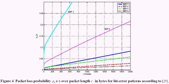 數(shù)組3到6的仿真結(jié)果更可靠,在會話應(yīng)用中需要低錯誤率的運送者。 假定一任意的字節(jié)的開始位置在文件包可能發(fā)生錯誤的位置里面。 這些錯誤可能性的所有數(shù)據(jù)錯誤在圖4中被顯示。 明顯可以看出錯誤率會因為包長度的增加而提高。從位率錯誤表格(BEP1和2)可知,當(dāng)包長度減少的時候丟包率是不可以接受的, 舉例來說,500個字節(jié), 丟失可能性高達(dá)25%. 高的錯誤率需要在鏈路層上重傳。