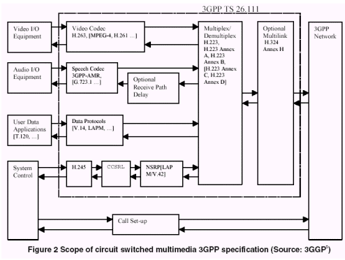 3G網(wǎng)絡(luò)上用于視頻通訊的3GPP標(biāo)準(zhǔn)定義了使用于視頻消息傳送(參看3.3部分)和視頻呼叫的視頻解碼器。在交換線路上實(shí)行64kbps速率的實(shí)時呼叫時,H.263是推薦標(biāo)準(zhǔn),如圖2所示?蛇x的其他視頻解碼器中,MPEG-4和H.261不是標(biāo)準(zhǔn)所要求的,但可作為可能的候選標(biāo)準(zhǔn)。
