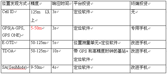 定位精度:GPS最高,GeoMode次之,E-OTD和TDOA次之,Cell ID最差;