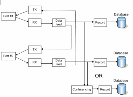 上圖中的媒體和控制數(shù)據(jù)流表示通過Prosody S (HMP) 或Prosody X板卡建立的兩個(gè)(或多個(gè))端點(diǎn)之間的呼叫。媒體流(RTP)和信令信息都通過監(jiān)控平臺本身傳輸,高級的應(yīng)用系統(tǒng)會記錄所有SIP/H.323事件和消息。傳真信息也可以存儲,保存在TiFF格式的圖形文件內(nèi)。這里,系統(tǒng)可以在兩端分別錄制RTP流,也可以采用會議的方式錄制在一起。