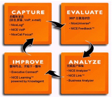 NICE System公司率先提出了CEM-客戶體驗(yàn)管理-的新觀念,是客戶體驗(yàn)管理的先驅(qū)者,它將此觀念融入在NICE錄音網(wǎng)控系統(tǒng)中,與ACD、CTI及CRM等客服中心既有的投資設(shè)備整合為一體,便可達(dá)到隨時(shí)掌握客戶與客服中心間的互動(dòng)經(jīng)驗(yàn),以期能夠隨時(shí)調(diào)整客服中心的經(jīng)營方向與策略,提升客戶的滿意度,并改善坐席人員的服務(wù)效率與品質(zhì)等。 在NICE CEM的概念中,主要是以四個(gè)作業(yè)循環(huán)達(dá)成改善的目標(biāo),包括記錄(Capture)、評(píng)估(Evaluate)、分析(Analyze)、改善(Improve)等。