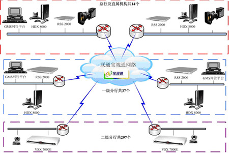 傳輸層:采用網(wǎng)通“寶視通”視頻會議運營網(wǎng),該網(wǎng)架構(gòu)在網(wǎng)通IP數(shù)據(jù)骨干網(wǎng)和本地傳輸與接入網(wǎng)之上的業(yè)務(wù)網(wǎng),采用H.264協(xié)議,面向民生行提供可管理的商用視頻會議網(wǎng)。