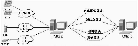 下圖為UMS系統(tǒng)的示意圖。其中IVR平臺與UMS 系統(tǒng)相連接。而UMS系統(tǒng)通過相應(yīng)的服務(wù)模塊與不同的網(wǎng)絡(luò)進(jìn)行信息共享,同時也可以和外部的Web Server進(jìn)行信息交互。