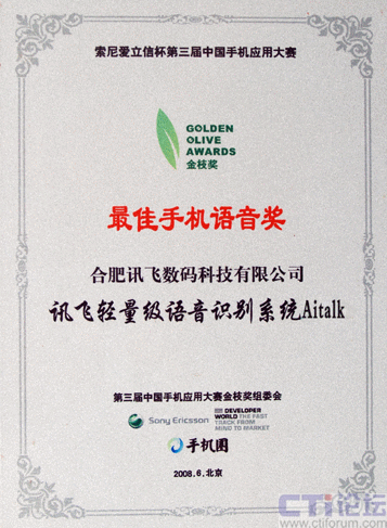 2008年6月26日,代表了中國手機應用最高水平、最新發(fā)展的索尼愛立信杯第三屆中國手機應用大賽金枝獎頒獎典禮在北京隆重舉行,科大訊飛全資子公司——訊飛數(shù)碼提交的參賽產(chǎn)品,輕量級語音識別系統(tǒng)Aitalk,榮獲本屆大賽 “最佳手機語音金枝獎”。這是科大訊飛既在本賽事首屆、第二屆獲此殊榮后,連續(xù)第三年奪得該獎項,充分體現(xiàn)了科大訊飛在手機語音應用領域具備的超群實力和絕對的領先地位。