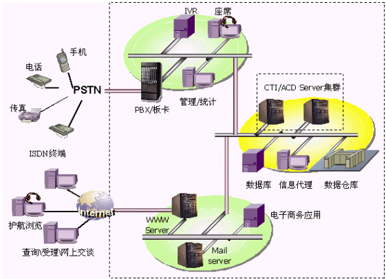 將PSTN訪問、Internet訪問有機結(jié)合,對傳統(tǒng)呼叫中心進行擴充,支持多種接入方式,多種交流渠道,具有傳統(tǒng)呼叫中心無法比擬的優(yōu)越性。