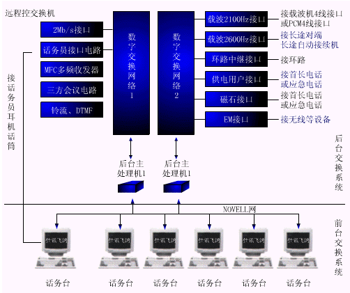"前臺座席系統(tǒng)"包括班長臺和話務(wù)臺,均采用微機,運用先進的計算機聯(lián)網(wǎng)技術(shù),將它們通過網(wǎng)絡(luò)與"后臺交換系統(tǒng)"相連。班長臺和所有話務(wù)臺的硬件連接完全相同,任何一臺損壞,不影響其它話務(wù)臺的使用,即不存在關(guān)鍵接點,提高了系統(tǒng)的安全可靠性。全漢化圖形界面,交互式人機操作方式,簡單明了,易于掌握。所有話務(wù)臺均為集記錄、查號、市話轉(zhuǎn)接、長話轉(zhuǎn)接為一體的綜合型人工話務(wù)臺,所有功能由數(shù)據(jù)定義,可分可合,可方便的進行設(shè)置,也可臨時并席,為系統(tǒng)高質(zhì)量的服務(wù)提供了可靠的基礎(chǔ)。所有話票均在計算機上填寫,由網(wǎng)絡(luò)自動傳送,不再使用紙話票,也不需人工分發(fā)話票,極大的減輕了勞動強度,提高了辦事效率。為了減小系統(tǒng)規(guī)模,我們將查詢、計費、統(tǒng)計、管理、維護五種功能融合為一體,統(tǒng)一成為多功能的班長臺,其功能亦可分可合,視用戶需求而定。