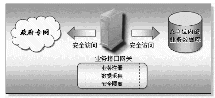 業(yè)務(wù)接入網(wǎng)關(guān)放置在每一個接入到本系統(tǒng)的部門或單位內(nèi),具有快速方便的異構(gòu)數(shù)據(jù)庫的連接能力,它主要完成兩個方面的功能,一方面實現(xiàn)本部門共享信息的對外發(fā)布,另一方面也通過核心的信息交換機實現(xiàn)其它相關(guān)部門的共享信息的采集工作。業(yè)務(wù)接口網(wǎng)關(guān)具有兩個網(wǎng)絡(luò)接口,一端連接本單位的內(nèi)部網(wǎng)絡(luò),另一端接入政府專網(wǎng)中。