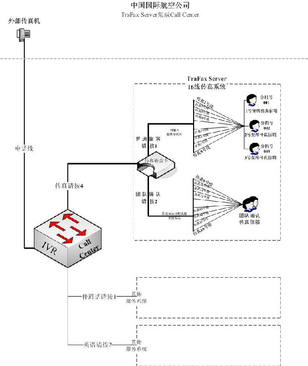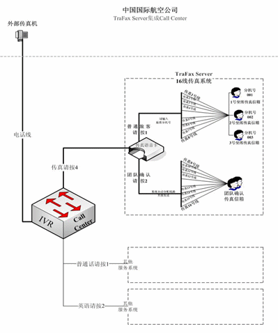 與國(guó)航Call Center集成后的TraFax Server系統(tǒng)共有16條傳真線(xiàn)路,其中一半專(zhuān)門(mén)用作接收普通旅客發(fā)來(lái)的傳真,另外8條線(xiàn)路則是為受理團(tuán)體客戶(hù)的傳真確認(rèn)而設(shè)。二者不同是,普通客戶(hù)在向國(guó)航發(fā)送傳真的過(guò)程中需要根據(jù)系統(tǒng)提示音在發(fā)送前的最后環(huán)節(jié)中輸入明確的坐席分機(jī)號(hào)碼,以使傳真文件發(fā)向分機(jī)號(hào)對(duì)用的坐席傳真信箱中,以此實(shí)現(xiàn)坐席人員對(duì)旅客的一對(duì)一式服務(wù),從而提高服務(wù)水平。而團(tuán)隊(duì)確認(rèn)的傳真無(wú)需輸入坐席分機(jī)號(hào),傳真將被空閑的線(xiàn)路直接發(fā)送到一個(gè)專(zhuān)門(mén)的團(tuán)隊(duì)確認(rèn)傳真信箱中,從而確保國(guó)航對(duì)該類(lèi)傳真的快速處理能力。目前,16線(xiàn)的TraFax