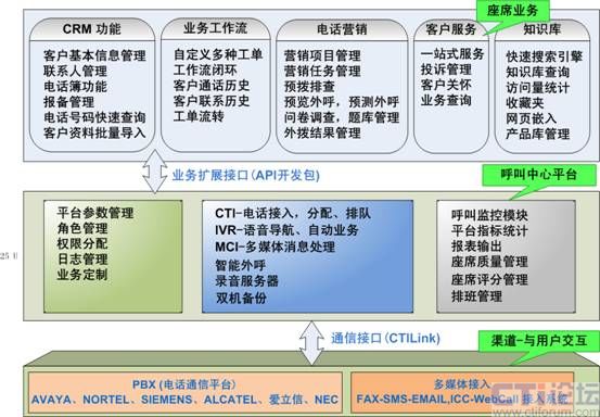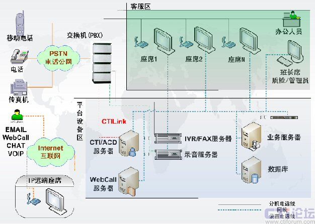 呼叫中心通信平臺,包含了交換機(jī)(PBX)、CTI服務(wù)器、IVR服務(wù)器、傳真服務(wù)器、全程錄音設(shè)備等幾個部分,是客服中心實施的基礎(chǔ)。