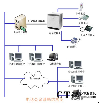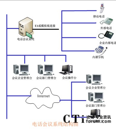 TalenTel CNF 電話會議系統(tǒng)需要與企業(yè)的PBX連接,如果沒有企業(yè)內(nèi)部程控交換機(jī)則可以將中繼線直接接在會議系統(tǒng)主機(jī)上,中繼線可以是普通模擬中繼,也可以是E1接口(如中國一號信令、30B+D等)。在與會議系統(tǒng)主機(jī)的同一網(wǎng)段上可以配置多個(gè)會議客戶端系統(tǒng),通過客戶端系統(tǒng)用戶可以隨時(shí)觀察和監(jiān)視會議系統(tǒng)的使用情況,并且可以建立常用用戶的用戶資料,也可以對常用用戶進(jìn)行分組,這樣要呼叫某些用戶開會時(shí)只需呼叫組用戶即可。