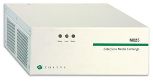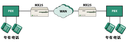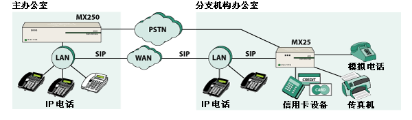 MX25 是一種能夠在兩種不同模式下工作的模塊化設(shè)備。在其中一種工作模式下,MX25 是一個通向 PSTN 網(wǎng)關(guān)的獨(dú)立 SIP。當(dāng)在這種模式下工作時,MX25 轉(zhuǎn)換電話呼叫的格式,使其可以在 IP 網(wǎng)絡(luò)與公用電話網(wǎng)絡(luò)之間傳遞。另一種工作模式是,將 MX25 作為 MX250 的功能延伸系統(tǒng),用于不超過 25 個用戶的分支辦公室。在這種配置下,MX25 與 MX250 通信并交換有關(guān)用戶和設(shè)備的信息。即使連接 MX250 和 MX25 的 WAN 鏈路出現(xiàn)故障,MX25 也能繼續(xù)工作并處理來自/發(fā)往 PSTN 的傳入/傳出呼叫。