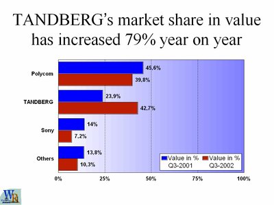 產(chǎn)地挪威,該品牌為視頻會(huì)議業(yè)界的高端產(chǎn)品。該品牌全系列均屬第三代產(chǎn)品,具有多項(xiàng)視頻會(huì)議的首創(chuàng)技術(shù),最高功耗只有65W,最高帶寬3M,是美國(guó)國(guó)防部、加拿大國(guó)防部、聯(lián)合國(guó)教科文組織、歐洲多個(gè)國(guó)家王室及大型跨國(guó)集團(tuán)選用的品牌,F(xiàn)在全球市場(chǎng)占有量第一位(依據(jù)2002年第3季度資料)。