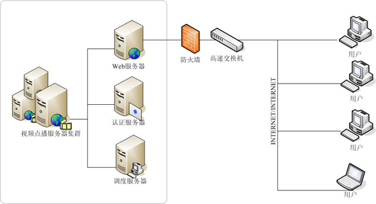 客戶可以通過訪問放置在甘肅省移動公司面機房內(nèi)的Web服務(wù)器,同時WEB服務(wù)器發(fā)送請求到認(rèn)證服務(wù)器,通過客戶AAA級認(rèn)證后的,客戶經(jīng)過調(diào)度服務(wù)器將請求反饋給視頻服務(wù)器,完成視頻點播流程,具體架構(gòu)如圖。